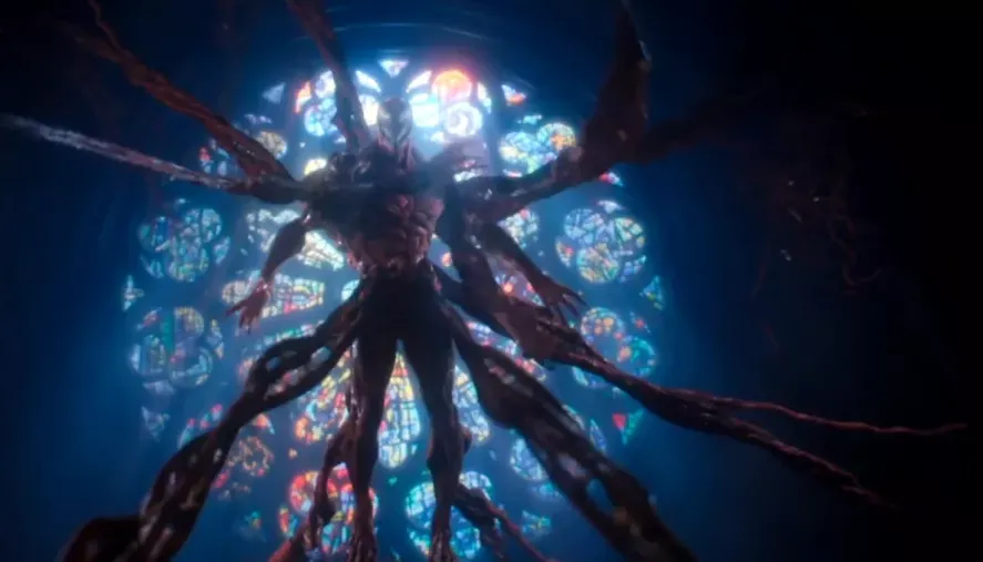 血蜘蛛登場在監獄打鬥時,身體周圍長出長觸角去依附到周圍的建築,這在漫畫中也有同樣的呈現,不過在影片展示過程中,這些觸角伸展出來,還有血蜘蛛在空中飛躍的一些動作,讓我聯想到了蜘蛛俠,尤其是最後在教堂血蜘蛛懸掛在彩色玻璃中央時,像是貼在自己做的蜘蛛網上。