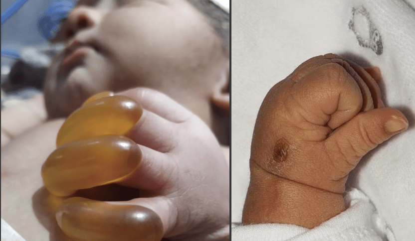 在男嬰被娩出期間,有醫護人員注意到男嬰正在吮吸手腕部。