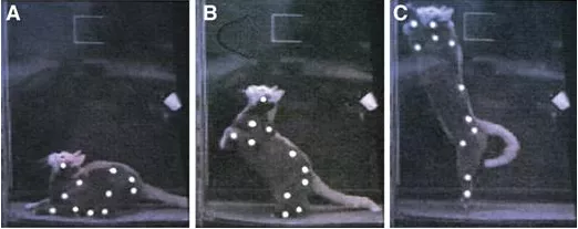 (A)深蹲,(B)中間起飛和(C)起飛時軀乾和後肢的完全伸展。