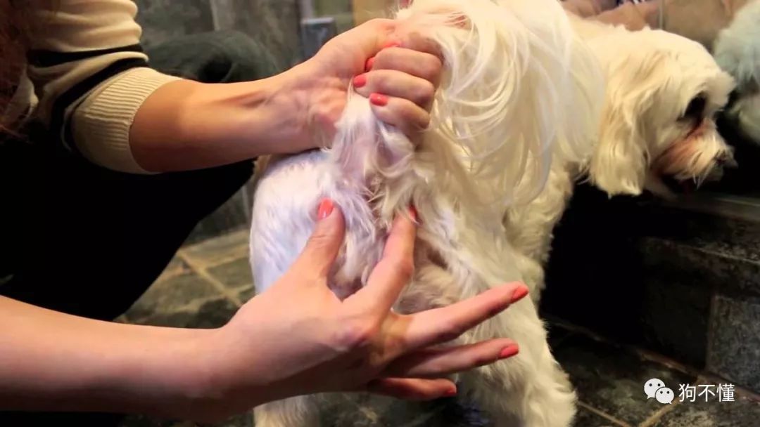 一隻手抓著狗尾巴,另一隻手施力擠壓
