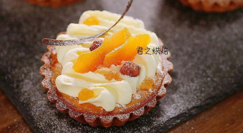 糖水杏從糖水中撈出擦乾水份,切成小塊鋪在撻底部。將香草卡仕達奶油裝入裱花袋,擠滿撻底。